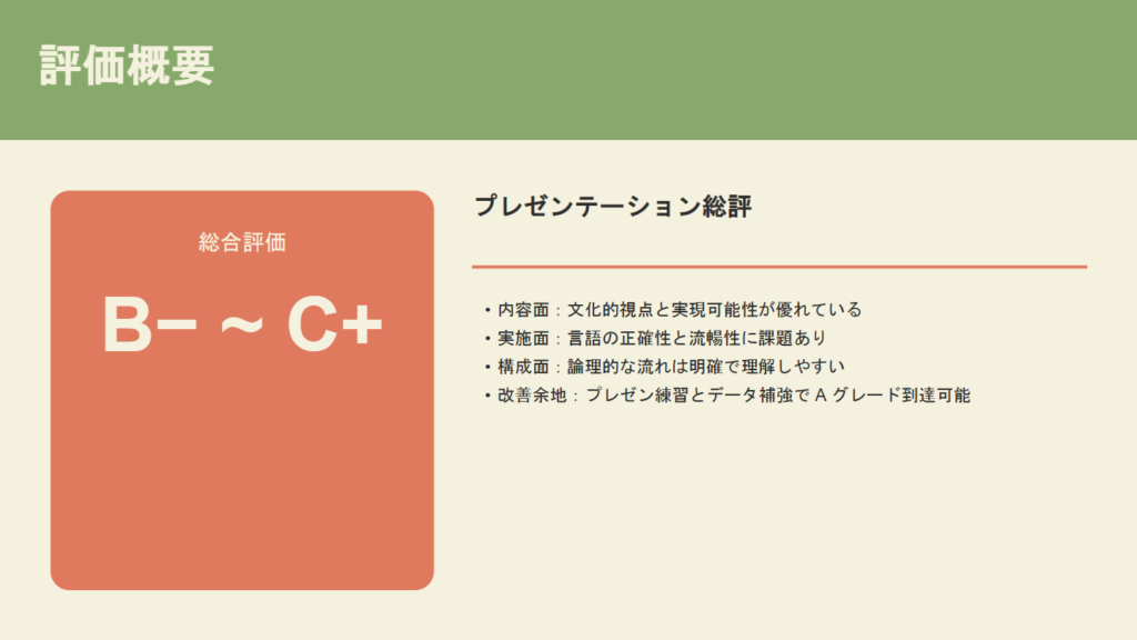「プレゼンテーションの実施面(言語の正確性、流暢性)が大きく足を引っ張っており